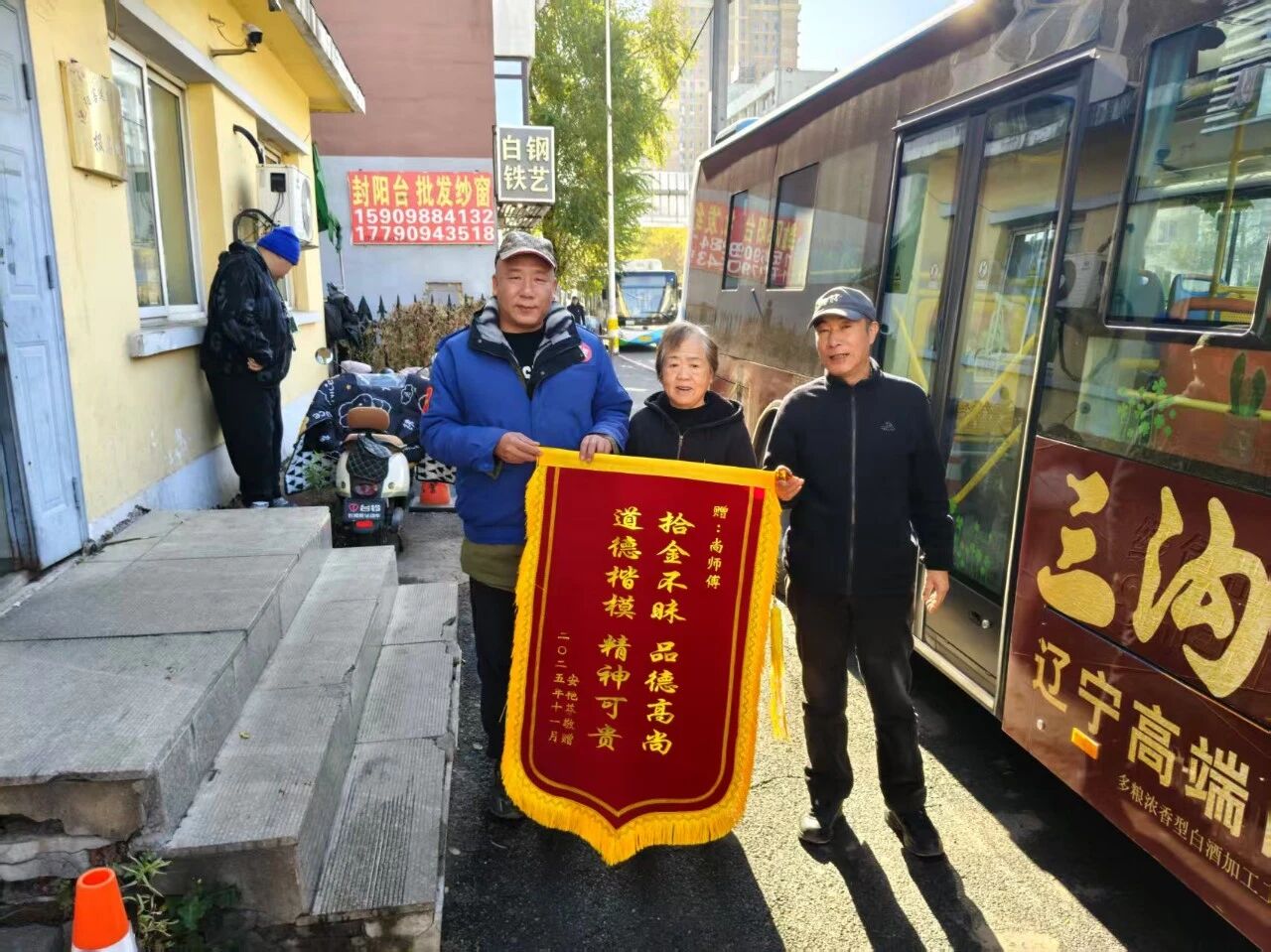 次日清晨,好消息如期而至。失主安女士手持錦旗專程趕到車隊駐地,一見到尚麒麟便緊緊握住他的手:“發(fā)現(xiàn)包不見時我急壞了!這錢是剛從銀行取出應(yīng)急用的,要是丟了真不知如何是好。”錦旗上“拾金不昧品德高尚 道德楷模精神可貴”的金色大字,映照著她激動的面容,“太感謝尚師傅了,您幫我挽回了重大損失!”